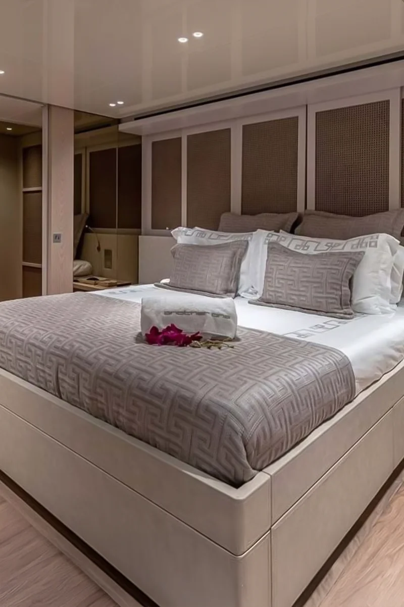 Master Suite: A full-beam, ultra-luxurious master cabin with a king-size bed, en-suite bathroom with a bathtub, walk-in closet, and private seating area.