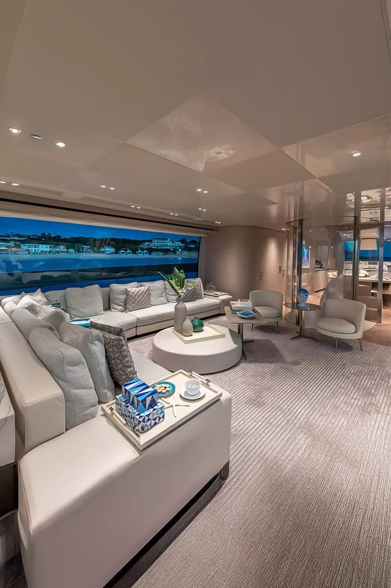 Elegant Main Salon: A bright and spacious interior with floor-to-ceiling windows, luxurious furnishings, and a high-end entertainment system.