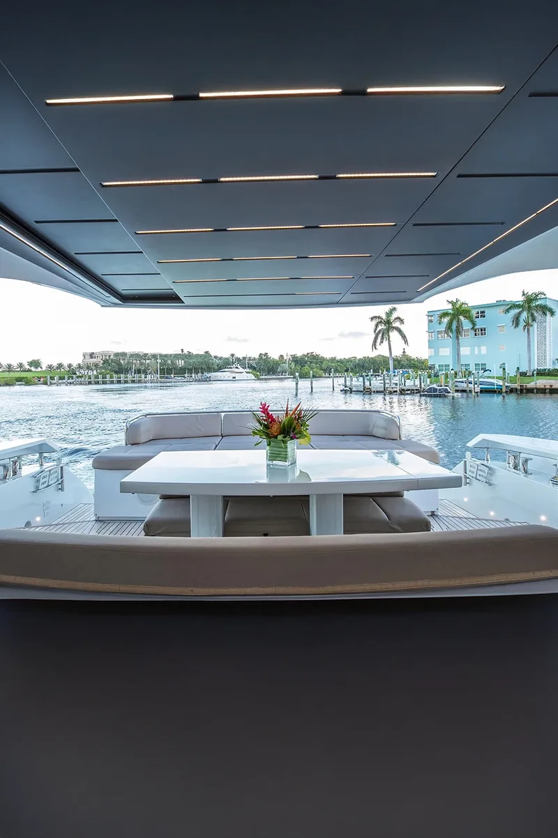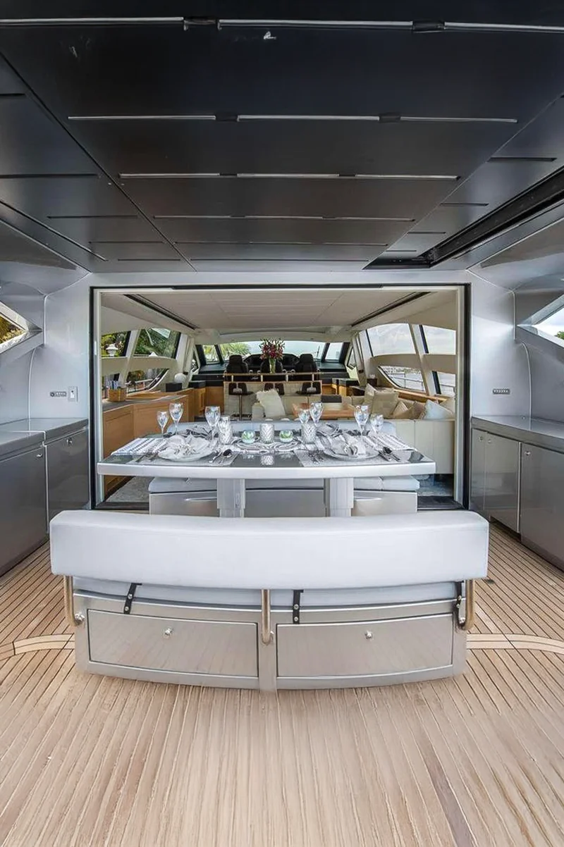 Flybridge: The expansive flybridge includes sunbathing areas, a wet bar, a dining table, and additional seating, perfect for outdoor relaxation and social gatherings.